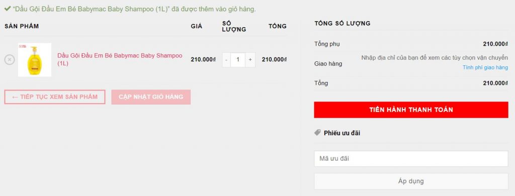 Bước 2: Kiểm tra lại thông tin giỏ hàng. Có thể chọn thêm sản phẩm bằng cách bấm vào Tiếp tục xem sản phẩm hoặc cập nhật lại số lượng, sản phẩm Cập nhật giỏ hàng. Sau khi đã đồng ý bấm Tiền hành thanh toán