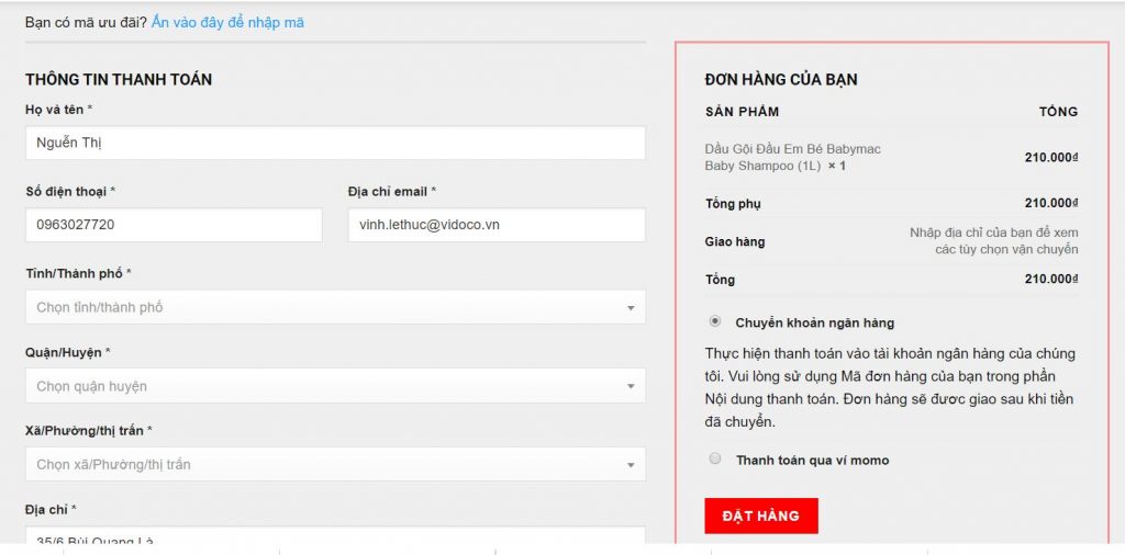 Bươc 3: Nhập đầy đủ thông tin nhận hàng. Kiểm tra thông ti chính xác thì bấm Đặt Hàng
