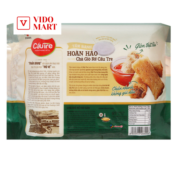 Chả giò rế hải sản từ Cầu Tre được chế biến từ tôm, thịt cua ghẹ, củ sắn, hành tím, và các loại gia vị như đường, tiêu, muối… Tất cả những nguyên liệu này đều tươi ngon và chất lượng. Chả giò này có lớp vỏ bánh tráng rế vàng tinh giáo, bên ngoài giòn rụm. Bên trong, bạn sẽ cảm nhận được sự ngọt ngào của hải sản, độ tươi giòn của sắn, bùi béo của khoai môn và vị thơm nồng của hành tiêu, mộc nhĩ,…
